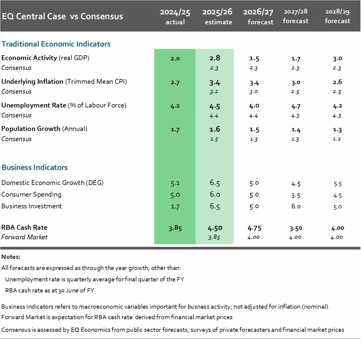 - The consensus view is constructed by EQ Economics from a range of sources including official forecasts, surveys of private sector forecasters and financial market prices.